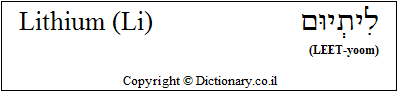 How to say "Lithium (Li)" in Hebrew (Listed in the Periodic Table of Elements category) Previous word: Literature | Next word: Live Learn Hebrew the Easy Way! Sign up for free and we will send youHebrew vocabulary words straightto your inbox, 6 days per week. It's free and you can unsubscribe at any time.